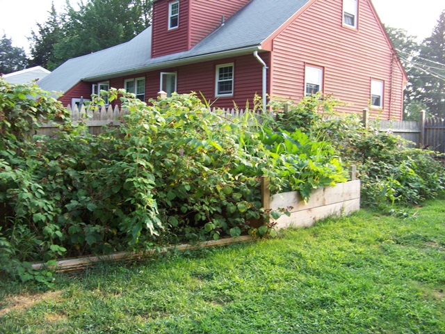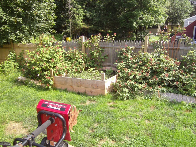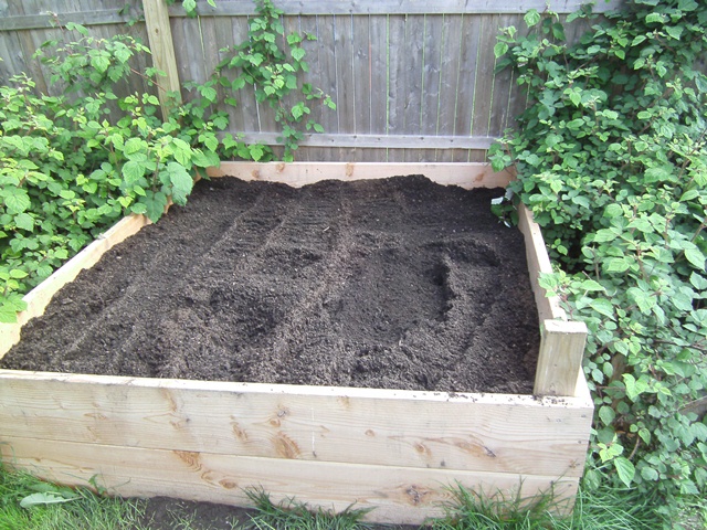 Official spot of new frame, have to train raspberries to grow on fence around the new garden bed |