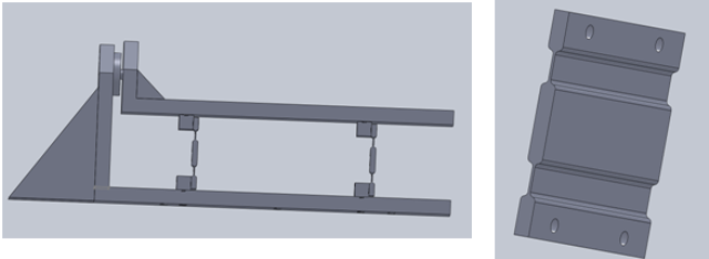 These are some of our initial designs. The first used two plates, the lower plate held a load cell and the upper plate secured the rocket on a dovetailed slide. This was designed to have the rocket slide in a linear motion into the load cell. We thought that issues with friction, side to side play and rocket assembly were too great with this design. The second design was mine, it used the same two plates (and would have the rocket mounted on the top plate as in the first design) but used two simple flex plates to allow flex in the forward direction but was extremely stiff in the side to side direction so as not to add side to side harmonic vibration to the equation. Clicking on the second picture gives some more details as to my design.