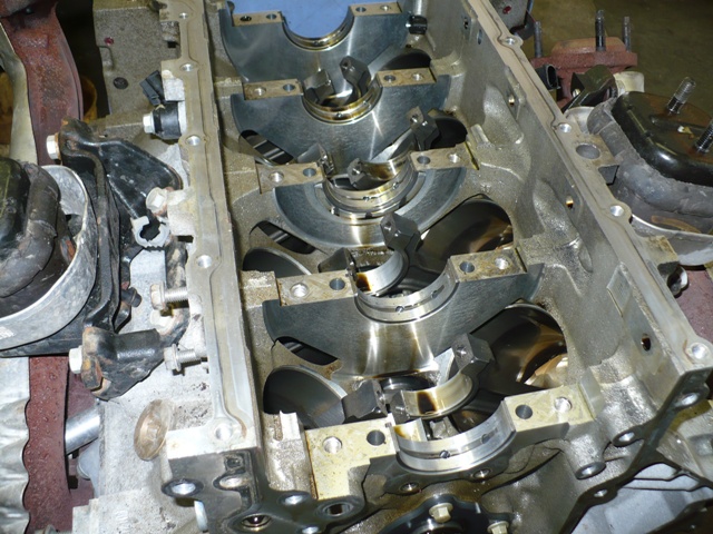 The old crank and all bearings were then removed. I cleaned all debris, installed new main bearings, installed crankshaft, installed all rod bearings and clearanced them also. There are only standard bearings available stock, but