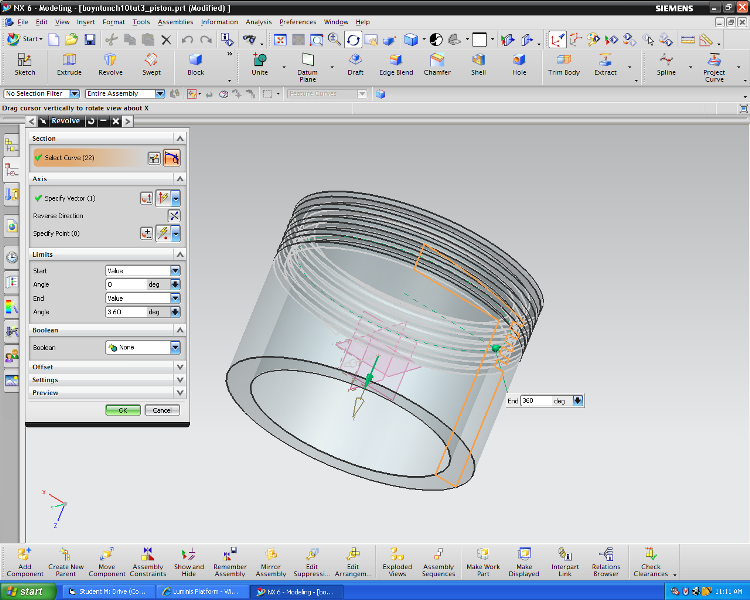 I then rotate this sketch around the center datum axis and rotate it a full 360 degrees to unite the beginning to the end. This makes the solid piston shown.
