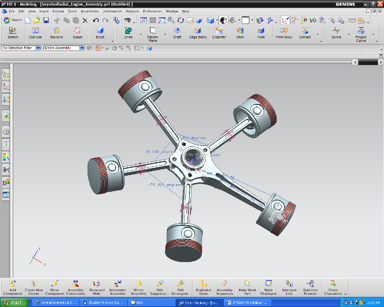 A piston, rings, pins and plugs were added to the master rod and four piston/rod subassemblies were added and linked to the rod. These parts were constrained using angles and aligning centerlines to make the final radial engine piston unit. Of course, I can rotate this assembly to any view or blow it up in size to check small details.