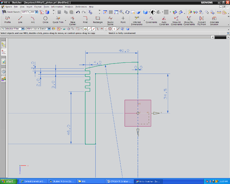 First I started with the piston, I will only have to make one of these and then load it five times for each of the five separate pistons in the engine. I sketch the profile from the center axis to one side and then reference all dimensions, set lines equal to each other and horizontal or parallel. I set radiuses and reference all of this to the center data coordinate system.
