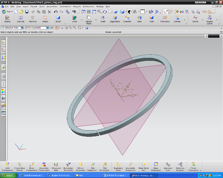 I then made a bunch of smaller parts and saved them into part files. I made the ring, shown here from a sketch and an extrusion. I added a datum plane to the part so it can be constrained in an assembly without rotating. This single ring file will be loaded into assemblies a total of twenty times.