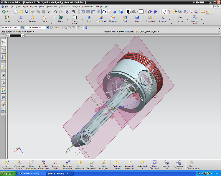The piston, four instances of the rings, a piston pin, and plugs were all assembled into a sub-assembly and that file was constrained together and saved. The color of the rings were changed to make them contrast for a better view. You can see the lower rod bushing assembled at a recessed level in the bottom of the rod. The plane in the center of that bushing allowed me to constrain it against rotation.