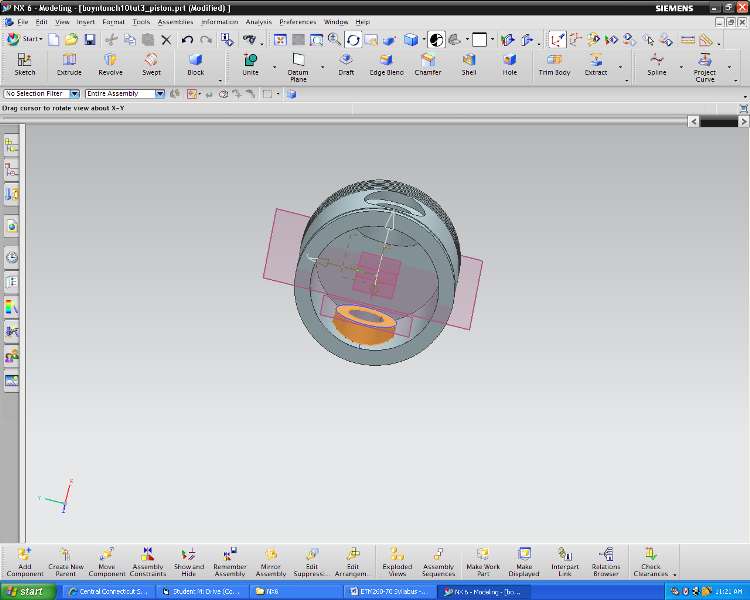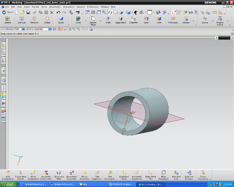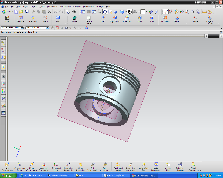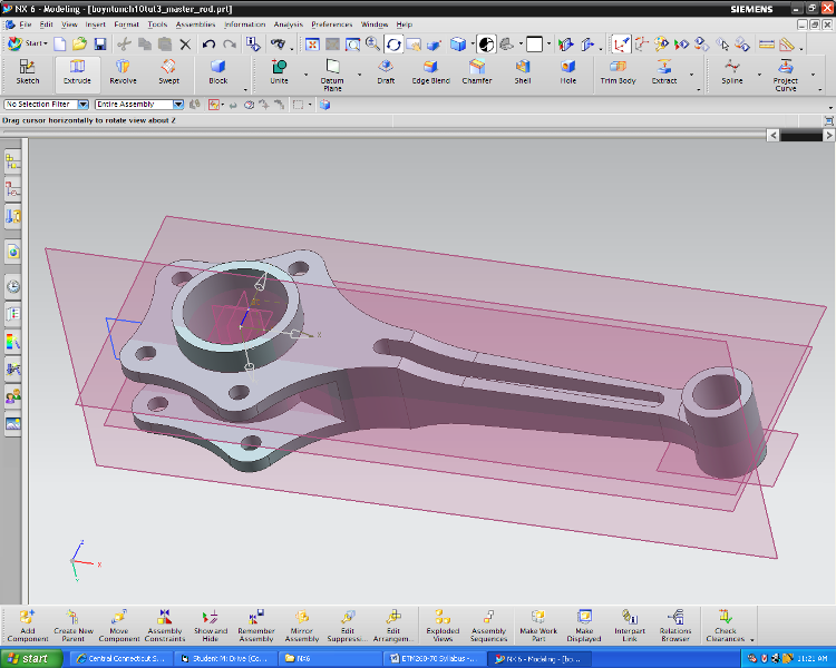 I've been learning to use the NX6 graphic modeling program at school. This is one of the neatest programs I've ever had the pleasure to work with. You can sketch items and then extrude them into solid parts. Then you can add features using additional sketches and datum planes or use form features such as bosses, blocks, cylinders and pads. You can also extrude pieces away from objects or subtract material with holes, pockets, grooves and slots. Features can also be mirrored and both circular and rectangular arrays for features can be made.