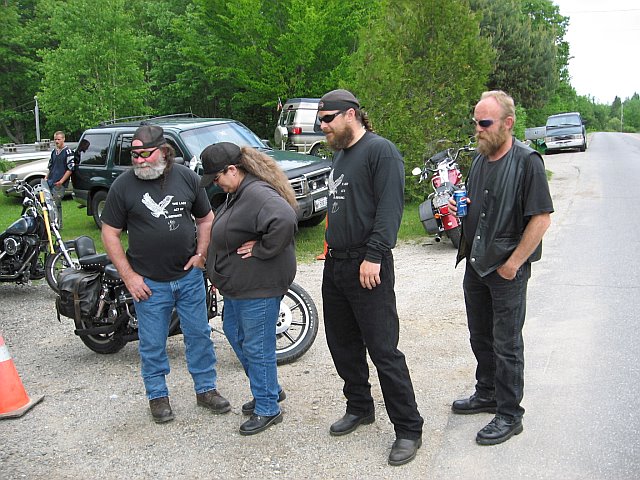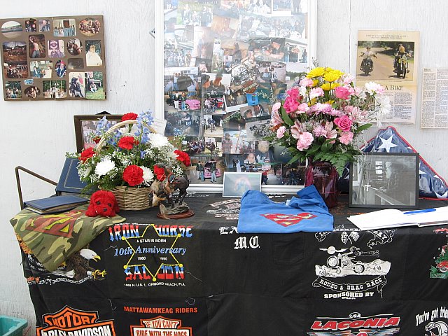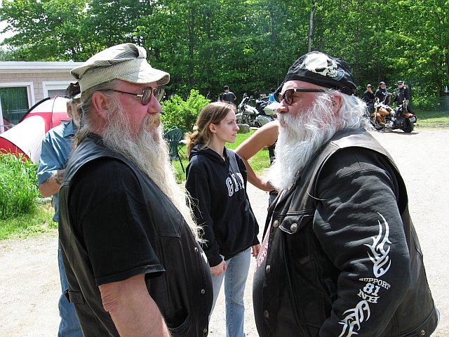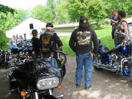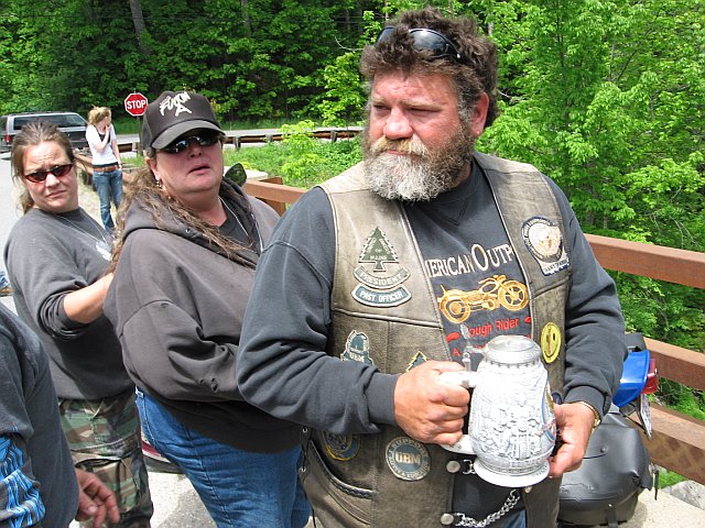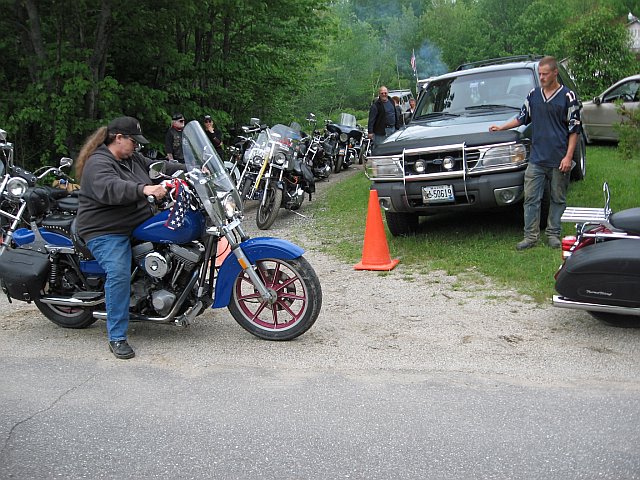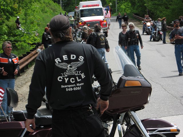 Here are some pictures from the funeral. I brought my bike up the night before and we had a small get together. Red's niece Kim and Bubba (Tony) had driven up to the middle of Maine from Orlando Florida with their bike and people had come in from all over such as Dave from Ohio and Rachel from Ct. The next day, bikes came pouring in throughout the morning and we had a long memorial ride for Red to the bridge where his brother's ashes had been spread. The fire and police escorted us as Red had been a volunteer firefighter for many years. We spread some ashes for Red off of the bridge and had a short ceremony. The funeral ended with a night long party with over a hundred people.